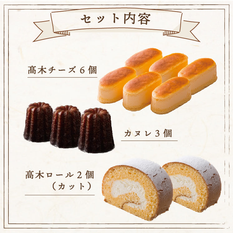 高木チーズ6個・カヌレ3個・高木ロール2カット |