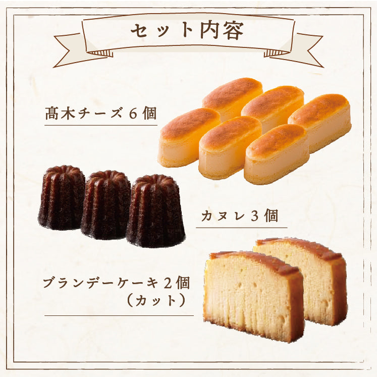 高木チーズ6個・カヌレ3個・ブランデーケーキ2カット |