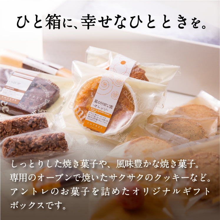 素材の味を最大限に引き上げるスチームベイクを使用し独自製法で味を最大限に引き立ています。しっとりした焼き菓子や、風味豊かな焼き菓子、サクサクのクッキーなど、アントレのお菓子を詰め合わせました。