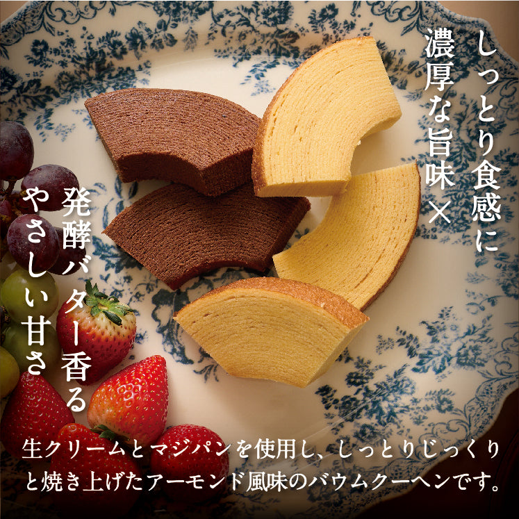 船橋アントレの「高木バウム」は、長年の洋菓子作りの技術とこだわりが詰まった、しっとりふんわり食感のバウムクーヘンです。生クリームとマジパンを使用し、しっとりじっくりと焼き上げたアーモンド風味の味わい。 優しい甘さの生地から発酵バターの香りが広がります。しっとり濃厚、カカオが薫るショコラ味も!