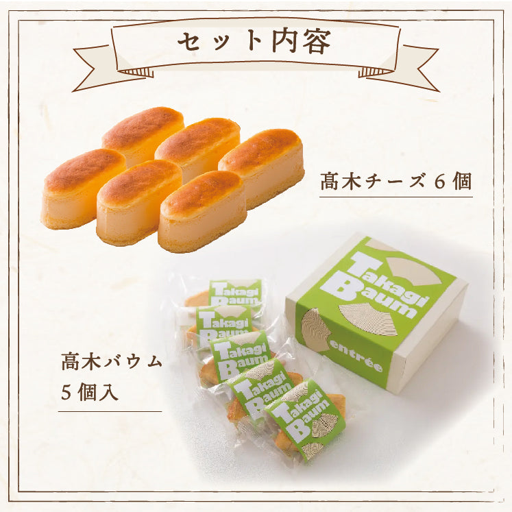 | 主な原材料 | 【高木チーズ】 クリームチーズ(フランス産)、牛乳、卵、砂糖、バター、小麦粉、蜂蜜、コーンスターチ、水あめ、クリームチーズ(KIRIブランド)、押本養鶏場の卵、皆川牧場の牛乳、サワークリーム、北海道産ビート糖、蜂蜜 【高木バウム】 卵(国産)、砂糖、小麦粉、発酵バター、ショートニング、生クリーム、ラム酒、スウィートアーモンド、塩、レモン汁、転化糖シロップ、膨張剤、乳化剤、香料、pH調整剤 |
