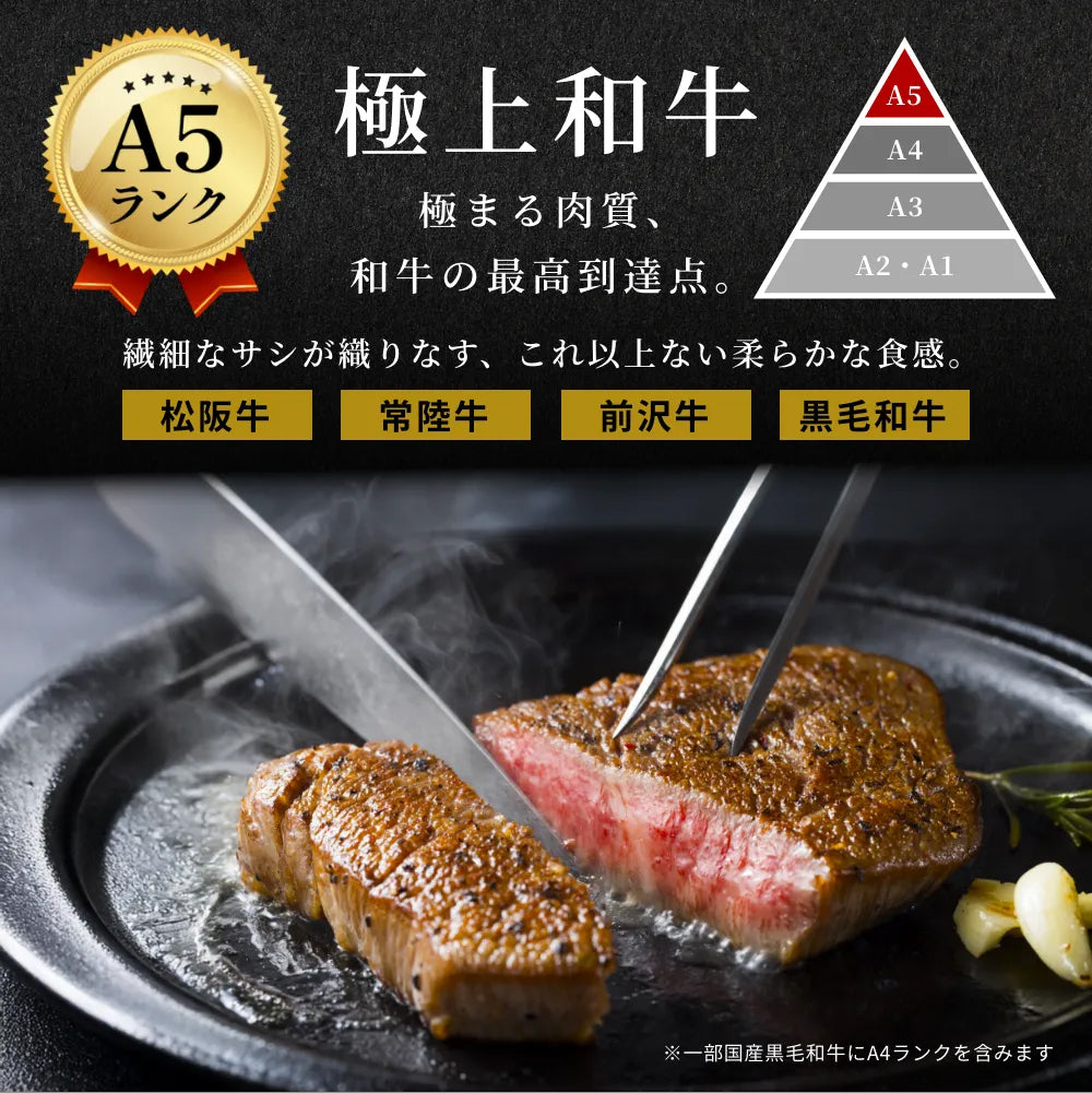 | 6. ステーキ(サーロイン・リブロース) | 松阪牛200g 常陸牛250g 前沢牛240g 国産黒毛和牛270g | |